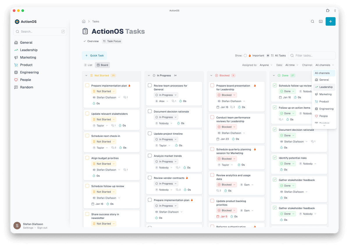 Most productivity tools show everything, forever. Channels turn into graveyards. Task lists turn into archaeology.The more a team commits to, the harder it becomes to see what actually needs attention.ActionHQ is built for follow-through, not accumulation.Tasks, actions, and updates surface when they need attention — and step back when they don’t. Active work stays visible. Inactive work doesn’t compete for focus. Nothing needs manual archiving, inbox-zero rituals, or constant re-organization.When progress changes, it resurfaces automatically. When nothing changes, it stays out of the way.For leaders, this means a clear view of what’s active, what’s at risk, and what needs input — without chasing updates or sifting through noise.Focus stays on execution. The system does the chasing.